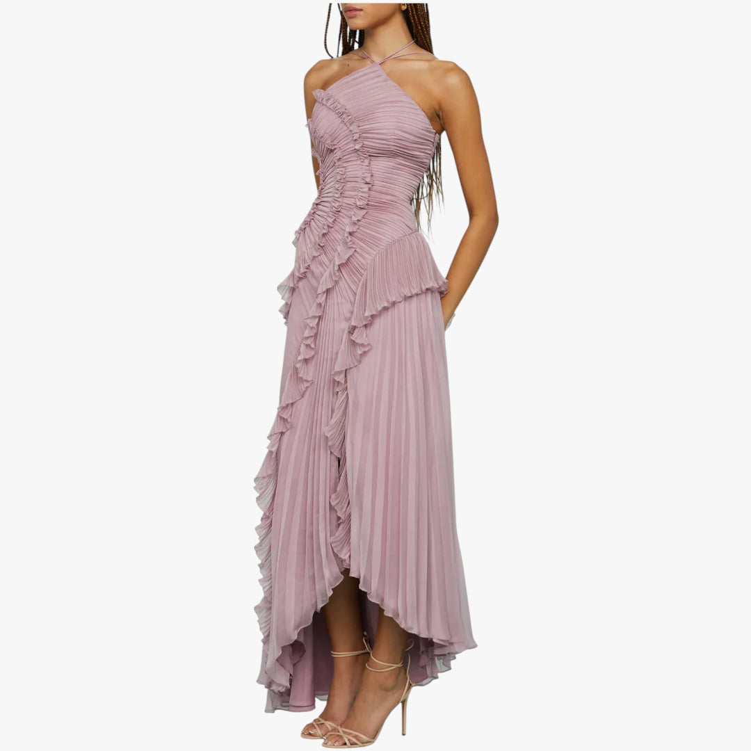 A flowing maxi with sculpted pleats and an asymmetric hem that moves beautifully at every step. The refined one-shoulder halter neckline frames the shoulders while soft ruching flatters the waist for a graceful, occasion-ready look.